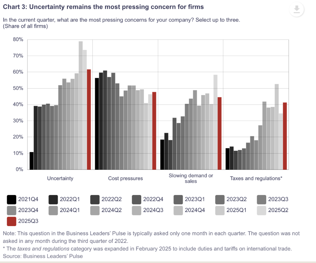 This chart told me that 80% of Canadian businesses felt “uncertainty” was the biggest concern in Q3 of 2025. For context, during Q4 of 2021 (aka during the COVID-19 Pandemic), only 11% of businesses felt “uncertainty” was their biggest concern.